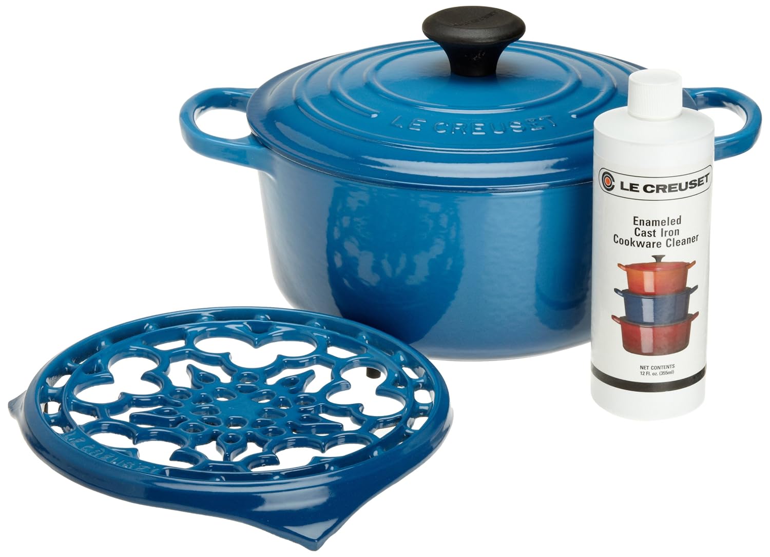 Le Creuset Cast Iron Cookware Gift Set, Marseille is best for youLe Creuset Signature Cast Iron Gift Set is the perfect present for weddings, graduations, birthdays or any other occasion. The 4-piece set includes a 4.5-quart Signature round French oven with lid, cast iron deluxe trivet and a bottle of cast iron cleaner. The round trivet's unique tripod construction is designed to elevate hot cookware above the surface of a counter or table, while its intricate center mirrors the detailed wrought iron architectural elements of the Belle Epoque (French for 'Beautiful Era'). Le Creuset cookware cleaner safely removes heat stains, discoloration, grit and grime, while preserving and enhancing the shine and polish of the cookware. The 12-ounce bottle stays easily capped for clean, worry-free storage and is small enough for even the most crowded cabinets and pantries.