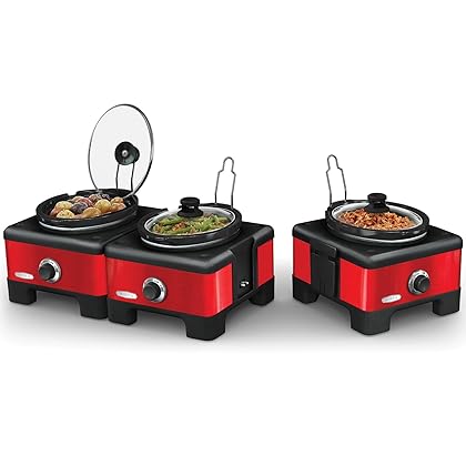 the BELLA 13956 LINX 3 X 2.5 QT Serve and Store Slow Cookers, Red Keeps food safe on the go with hinged locking lids and carrying handles. With these features, there’s no need to repack food in other containers, making travel a breeze.You can customize your cooking time and temperature by setting the timer anywhere between 30 minutes and 20 hours on the “High,” “Low,” or “Warm” settings. The digital timer counts down the remaining time so you can coordinate side dish preparation and have a complete meal ready when you are. If you’re not around when time runs out, this countdown expert will automatically shift to “Warm,” maintaining temperature and flavor. The digital timer will count up the time that it has been operating on “Warm” for up to 6 hours, simplifying mealtime so you don’t have to keep track. The Crock-Pot Cook & Carry Slow Cooker is just as at home in the kitchen as it is on the road. With a stylish, stainless finish and convenient lid locks that nestle neatly in with the lid, your countertop is sure to look sleek and clean. The stoneware transfers easily from the stainless steel frame to the table or refrigerator.