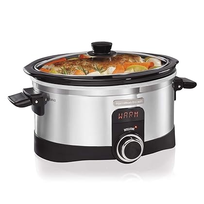 the Hamilton Beach 33564 IntelliTime Digital Countertop Slow Cooker, 6-Quart Keeps food safe on the go with hinged locking lids and carrying handles. With these features, there’s no need to repack food in other containers, making travel a breeze.You can customize your cooking time and temperature by setting the timer anywhere between 30 minutes and 20 hours on the “High,” “Low,” or “Warm” settings. The digital timer counts down the remaining time so you can coordinate side dish preparation and have a complete meal ready when you are. If you’re not around when time runs out, this countdown expert will automatically shift to “Warm,” maintaining temperature and flavor. The digital timer will count up the time that it has been operating on “Warm” for up to 6 hours, simplifying mealtime so you don’t have to keep track. The Crock-Pot Cook & Carry Slow Cooker is just as at home in the kitchen as it is on the road. With a stylish, stainless finish and convenient lid locks that nestle neatly in with the lid, your countertop is sure to look sleek and clean. The stoneware transfers easily from the stainless steel frame to the table or refrigerator.