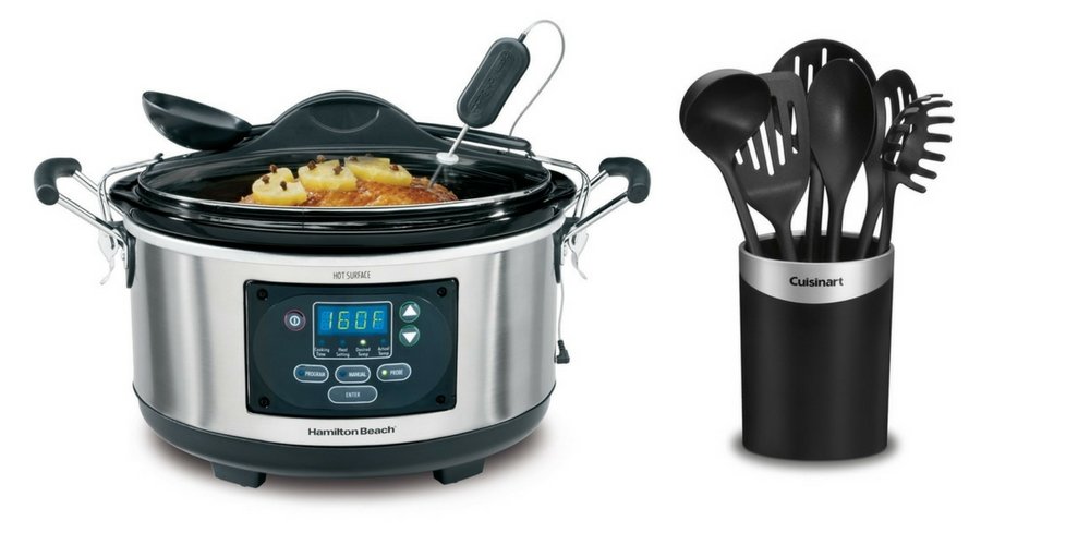 Hamilton Beach 33967 Set 'n Forget 6-Quart Stainless Steel Programmable Slow Cooker and Slow Cooker Tools is best for youHamilton Beach 33967 Cook the perfect meal with this Hamilton Beach 6-quart Programmable Slow Cooker. Made of premium die-cast aluminum and offering six quarts of cooking space (enough to cook a 6-pound chicken or a 4-pound roast), this Hamilton Beach 6-quart Programmable Slow Cooker is the perfect slow cooker for most meals. The cooker heats evenly on most any stove top. A digital timer and adjustment buttons make sure your slow cooker recipes are cooked to perfection. One touch buttons make programming simple. This Hamilton Beach 6-quart Programmable Slow Cooker is lightweight and easy to use. The convenience of one pan means less dishes to clean, and it's brushed stainless steel design will give any counter top a stylish touch. Dishwasher safe stoneware and lid make clean up a snap. Slow Cooker Tools Cuisinart gathers the home cook's essential curve design tools and makes them available in a crock that's ready for the countertop. This includes everything anyone needs to get cooking. Each tool is designed to lie flat on the countertop and will not roll. The smooth surface of these black-colored nylon tools makes it easy to clean them, even in a dishwasher. Use them with your non-stick cookware to prevent damage to the sensitive surfaces of your pots and pans. The nylon heads on these tools are heat resistant up to 450 degrees Fahrenheit, so you need not worry about the tools melting due to overheating.