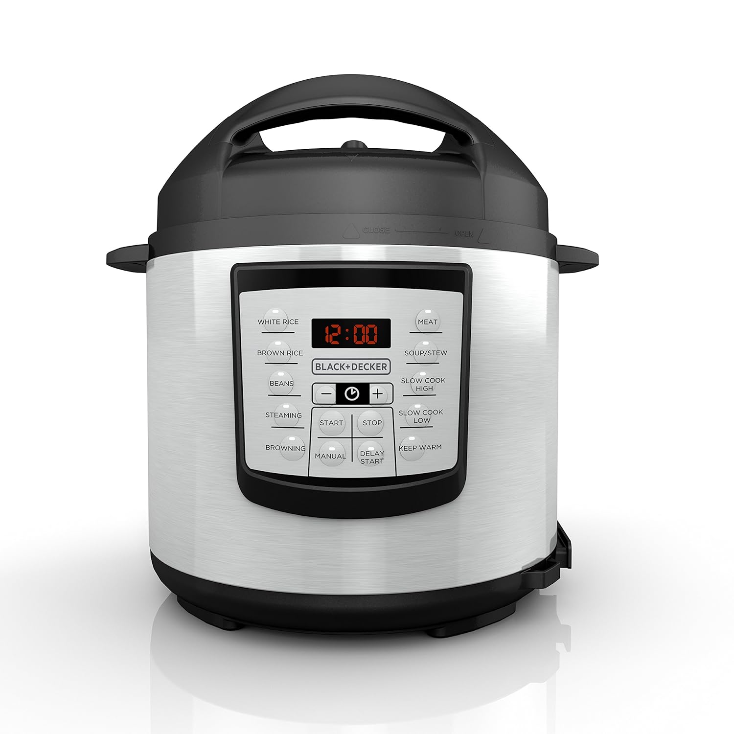 BLACK+DECKER PR100 6 Quart Programmable Pressure Cooker with 7 Pressure Functions, Stainless Steel Pressure Cooker is best for youBLACK+DECKER 6-Quart pressure cooker gets your favorite meals to the table in no time by sealing in heat, steam, and flavor throughout the cooking process. Choose from seven dedicated pressure functions to make all your favorites: rice, beans, all types of meat, soups, stews, and plenty more. You can even Brown meat with the browning function before pressure-cooking it to perfection. Other non-pressure functions include traditional slow cooking (high and low) and keeping food warm. Safety is a priority with this pressure cooker, and it's designed with nine independent safety checks to ensure the unit works correctly and safely every time. Plus, the digital controls and delay timer make it easy to select the exact function and time you desire. Enjoy fast cooking? how does fast cleanup sound?! the nonstick cooking bowl is dishwasher-safe and so are these included accessories: trivet, rice-measuring cup, and nonstick-friendly serving spoon. Also included is a recipe book packed with delicious meals designed especially for pressure-cooking. Get ready to save time in the kitchen! the BLACK+DECKER 6-Quart pressure cooker is the perfect way to make delicious food fast!