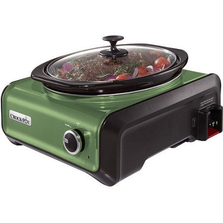 the Crock-Pot Hook Up Oval 3.5-Quart Connectable Entertaining System / Color:Metallic Sage Keeps food safe on the go with hinged locking lids and carrying handles. With these features, there’s no need to repack food in other containers, making travel a breeze.You can customize your cooking time and temperature by setting the timer anywhere between 30 minutes and 20 hours on the “High,” “Low,” or “Warm” settings. The digital timer counts down the remaining time so you can coordinate side dish preparation and have a complete meal ready when you are. If you’re not around when time runs out, this countdown expert will automatically shift to “Warm,” maintaining temperature and flavor. The digital timer will count up the time that it has been operating on “Warm” for up to 6 hours, simplifying mealtime so you don’t have to keep track. The Crock-Pot Cook & Carry Slow Cooker is just as at home in the kitchen as it is on the road. With a stylish, stainless finish and convenient lid locks that nestle neatly in with the lid, your countertop is sure to look sleek and clean. The stoneware transfers easily from the stainless steel frame to the table or refrigerator.