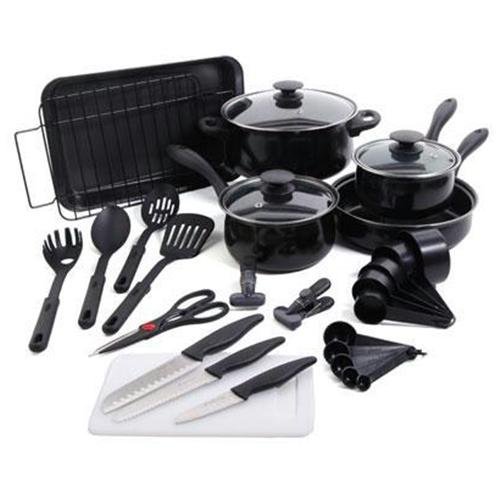 - Includes colander, pot with lid, 2 pans, 2 wooden utensils, and rack