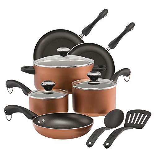 red cookware set provides the pieces essential for day top day cooking. The unique T-fal Thermo-Spot heat indicator shows when T-fal pan is perfectly preheated to seal in the flavor of your food. The non-stick exterior is fast and easy to clean and the cookware set is dishwasher safe. The 12-piece set is compatible with all cooktops except induction. This 12-piece set includes 7.75-inch and 11-inch fry pans, 1-quart and 2-quart sauce pans with lids, 5.5-quart dutch oven with lid, 10.25-inch griddle, spoon, ladle, and slotted spatula.the Paula Deen Dishwasher Safe Nonstick Cookware Set, 11-Piece, Copper red cookware set come with Thermo-Spot technology. Thermo-Spot is T-fal’s unique heat indicator that shows when your pan is perfectly preheated. Adding food to a properly preheated pan seals in the natural juices of meat, poultry and fish for moist, delicious results.The T-fal Signature Non-stick cookware set features Expert non-stick interior which is exceptionally durable and scratch resistant. Expert non-stick interior is safe for use with metal utensils. The non-stick exterior is fast and easy to clean and is dishwasher safe. The even heat base allows for even heat distribution for reliable cooking results.Created with the home chef in mind, T-fal Signature nonstick cookware provides an array of user-friendly features. Its innovative T-fal Thermo-Spot heat indicator makes it easy to properly pre-heat pans, which helps seal in the flavor of food, whether sautéing or searing. When the pattern in the center turns to a solid red spot, the pan is hot and ready to cook. The cookware’s heavy-gauge aluminum construction heats quickly and offers long-lasting strength, while its even-heat base distributes heat throughout for reliable cooking results. Use the cookware on any cook top, except for induction. Recyclable and PFOA-, Lead-, and Cadmium-free, the cookware’s durable nonstick surfaces—inside and out—offer effortless food release (little to no fat needed), quick and easy cleaning, and a healthier choice when it comes to cookware.Paula Deen Dishwasher Safe Nonstick Cookware Set, 11-Piece, Copper is best for youDish it up and dish it out with the Paula Deen Dishwasher Safe Nonstick 11-Piece Cookware Set, combining durability and performance with classic style. This 11-piece cookware set furnishes any kitchen with the necessities required to create everything from Paula’s Chicken Fried Steak to classic bread pudding. The cookware is constructed from aluminum for fast and even heating, and the interiors are coated with long-lasting nonstick so foods can be transferred easily to serving plates without sticking to pots and pans. With the shatter-resistant glass lids, the cooking process can be monitored without heat and moisture loss, and the lid knobs are accented with copper for a stylish look. Depend on Paula Deen to make cookware that cooks as good as she does! The cookware handles are double riveted for extra strength. Hanging loops provide convenient storage options in any size kitchen, and the cookware is oven safe to 350°F. Best of all, this line of cookware is dishwasher safe so cleaning up is always easy as pie. This set even comes with the sturdy nylon Prestige(r) nonstick-suitable slotted turner and solid spoon so cooks can start making Paula's recipes their own right away. Grab hold of a Paula Deen Dishwasher Safe Nonstick 11-Piece Cookware Set to bring home convenience and style in a cooking set that's got a piece for every dish.