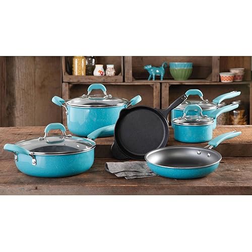 • The The Pioneer Woman Vintage Speckle 10-Piece Non-Stick Pre-Seasoned Turquoise Cookware Set, Dishwasher Safe is a