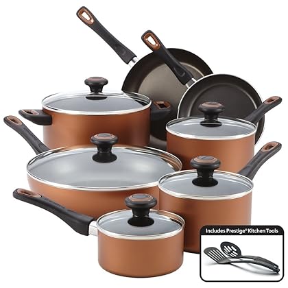 red cookware set provides the pieces essential for day top day cooking. The unique T-fal Thermo-Spot heat indicator shows when T-fal pan is perfectly preheated to seal in the flavor of your food. The non-stick exterior is fast and easy to clean and the cookware set is dishwasher safe. The 12-piece set is compatible with all cooktops except induction. This 12-piece set includes 7.75-inch and 11-inch fry pans, 1-quart and 2-quart sauce pans with lids, 5.5-quart dutch oven with lid, 10.25-inch griddle, spoon, ladle, and slotted spatula.the 14-Piece Cookware Set red cookware set come with Thermo-Spot technology. Thermo-Spot is T-fal’s unique heat indicator that shows when your pan is perfectly preheated. Adding food to a properly preheated pan seals in the natural juices of meat, poultry and fish for moist, delicious results.The T-fal Signature Non-stick cookware set features Expert non-stick interior which is exceptionally durable and scratch resistant. Expert non-stick interior is safe for use with metal utensils. The non-stick exterior is fast and easy to clean and is dishwasher safe. The even heat base allows for even heat distribution for reliable cooking results.Created with the home chef in mind, T-fal Signature nonstick cookware provides an array of user-friendly features. Its innovative T-fal Thermo-Spot heat indicator makes it easy to properly pre-heat pans, which helps seal in the flavor of food, whether sautéing or searing. When the pattern in the center turns to a solid red spot, the pan is hot and ready to cook. The cookware’s heavy-gauge aluminum construction heats quickly and offers long-lasting strength, while its even-heat base distributes heat throughout for reliable cooking results. Use the cookware on any cook top, except for induction. Recyclable and PFOA-, Lead-, and Cadmium-free, the cookware’s durable nonstick surfaces—inside and out—offer effortless food release (little to no fat needed), quick and easy cleaning, and a healthier choice when it comes to cookware.14-Piece Cookware Set is best for you21650 Features: -The SmartGlide® Nonstick System with durable DuPont Polytetrafluoroethylene® Plus features a textured nonstick surface that heats food quickly and evenly.. -Glass lids allow monitoring of cooking without compromising food heat or moisture.. -The comfortable cookware handles provide confident grip.. -For fast and easy cleanup, this cookware set is conveniently dishwasher safe.. -Oven safe to 350°F.. -Includes a Prestige® slotted turner and slotted spoon.. Color: -Copper. Material: -Aluminum. Number of Items Included: -9. Non-Stick Surface: -Yes. Dimensions: Overall Product Weight: -18.9 lbs.