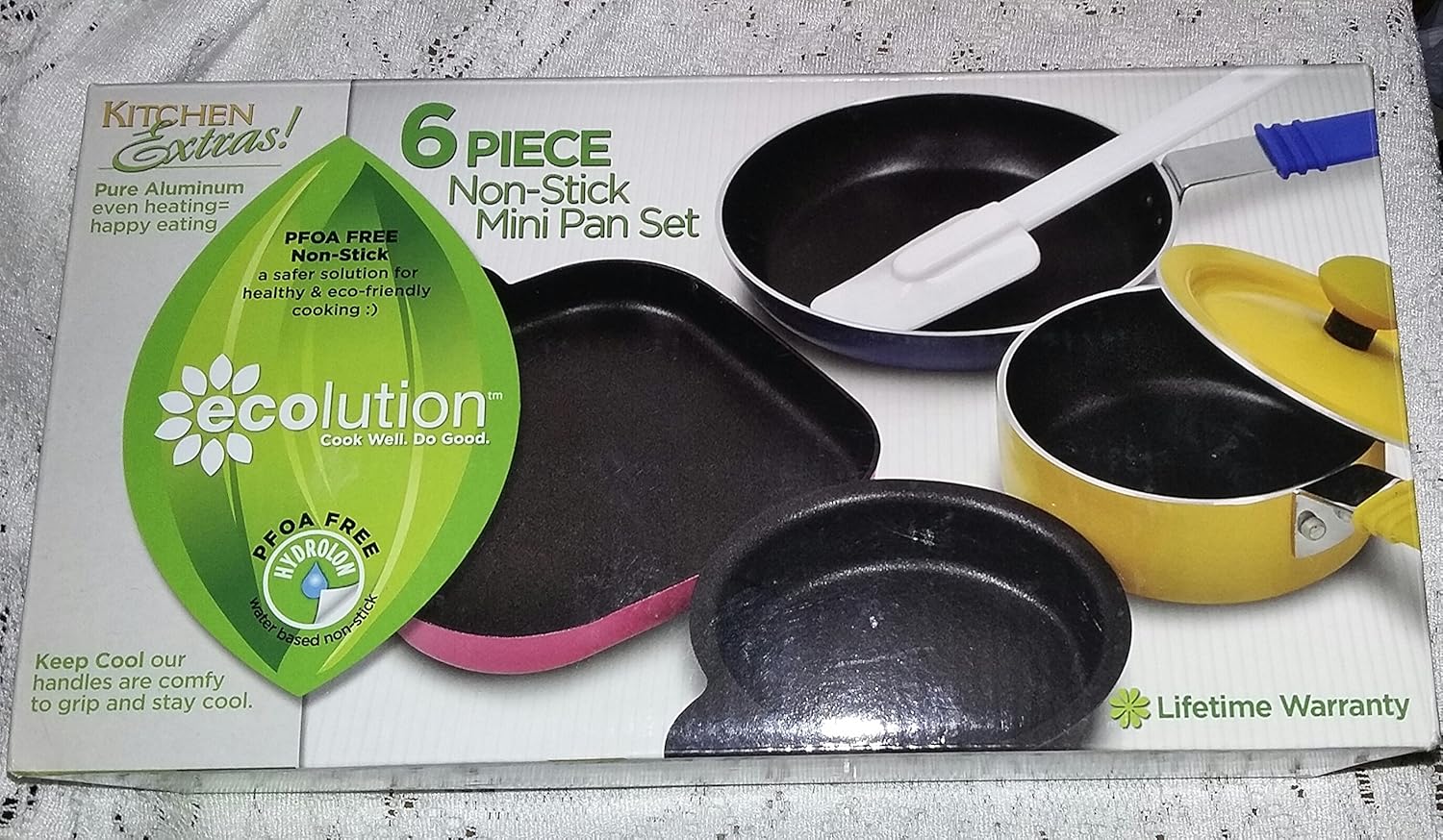 red cookware set provides the pieces essential for day top day cooking. The unique T-fal Thermo-Spot heat indicator shows when T-fal pan is perfectly preheated to seal in the flavor of your food. The non-stick exterior is fast and easy to clean and the cookware set is dishwasher safe. The 12-piece set is compatible with all cooktops except induction. This 12-piece set includes 7.75-inch and 11-inch fry pans, 1-quart and 2-quart sauce pans with lids, 5.5-quart dutch oven with lid, 10.25-inch griddle, spoon, ladle, and slotted spatula.the 6 Pc Cook Set Extra Mini 4 Ct red cookware set come with Thermo-Spot technology. Thermo-Spot is T-fal’s unique heat indicator that shows when your pan is perfectly preheated. Adding food to a properly preheated pan seals in the natural juices of meat, poultry and fish for moist, delicious results.The T-fal Signature Non-stick cookware set features Expert non-stick interior which is exceptionally durable and scratch resistant. Expert non-stick interior is safe for use with metal utensils. The non-stick exterior is fast and easy to clean and is dishwasher safe. The even heat base allows for even heat distribution for reliable cooking results.Created with the home chef in mind, T-fal Signature nonstick cookware provides an array of user-friendly features. Its innovative T-fal Thermo-Spot heat indicator makes it easy to properly pre-heat pans, which helps seal in the flavor of food, whether sautéing or searing. When the pattern in the center turns to a solid red spot, the pan is hot and ready to cook. The cookware’s heavy-gauge aluminum construction heats quickly and offers long-lasting strength, while its even-heat base distributes heat throughout for reliable cooking results. Use the cookware on any cook top, except for induction. Recyclable and PFOA-, Lead-, and Cadmium-free, the cookware’s durable nonstick surfaces—inside and out—offer effortless food release (little to no fat needed), quick and easy cleaning, and a healthier choice when it comes to cookware.6 Pc Cook Set Extra Mini 4 Ct is best for youEcolution cookware features Hydrolon - our ecologically advanced, water-based nonstick coating. Made without PFOA, Hydrolon emits fewer greenhouse gases, making cooking safer for you and the environment. The Kitchen Extras 6-Piece Mini Cookware Set includes miniature sizes of popular pans in bright, cheerful colors. Featuring comfortable-to-grip silicone handles, the pans are oven-safe up to 350 degrees and dishwasher safe. Since the pans are made of pure aluminum, consistent heating is guaranteed, and even heating = happy eating Set includes: 6-inch Mini Fry Pan, 6-inch Mini Griddle, 0.3-Quart Saucepan with lid, egg poacher, and silicone spatula. (Note: This Product Description Is Informational Only. Always Check The Actual Product Label In Your Possession For The Most Accurate Ingredient Information Before Use. For Any Health Or Dietary Related Matter Always Consult Your Doctor Before Use.) 741393422047