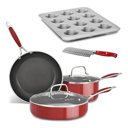 • The 6 Pc KitchenAid Non-Stick Induction Cookware Set Includes Muffin Pan & 4.5" Santoku Knife, Red is a