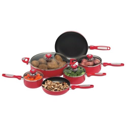 red cookware set provides the pieces essential for day top day cooking. The unique T-fal Thermo-Spot heat indicator shows when T-fal pan is perfectly preheated to seal in the flavor of your food. The non-stick exterior is fast and easy to clean and the cookware set is dishwasher safe. The 12-piece set is compatible with all cooktops except induction. This 12-piece set includes 7.75-inch and 11-inch fry pans, 1-quart and 2-quart sauce pans with lids, 5.5-quart dutch oven with lid, 10.25-inch griddle, spoon, ladle, and slotted spatula.the Chef's Secret 16-Piece Red Aluminum Cookware Set red cookware set come with Thermo-Spot technology. Thermo-Spot is T-fal’s unique heat indicator that shows when your pan is perfectly preheated. Adding food to a properly preheated pan seals in the natural juices of meat, poultry and fish for moist, delicious results.The T-fal Signature Non-stick cookware set features Expert non-stick interior which is exceptionally durable and scratch resistant. Expert non-stick interior is safe for use with metal utensils. The non-stick exterior is fast and easy to clean and is dishwasher safe. The even heat base allows for even heat distribution for reliable cooking results.Created with the home chef in mind, T-fal Signature nonstick cookware provides an array of user-friendly features. Its innovative T-fal Thermo-Spot heat indicator makes it easy to properly pre-heat pans, which helps seal in the flavor of food, whether sautéing or searing. When the pattern in the center turns to a solid red spot, the pan is hot and ready to cook. The cookware’s heavy-gauge aluminum construction heats quickly and offers long-lasting strength, while its even-heat base distributes heat throughout for reliable cooking results. Use the cookware on any cook top, except for induction. Recyclable and PFOA-, Lead-, and Cadmium-free, the cookware’s durable nonstick surfaces—inside and out—offer effortless food release (little to no fat needed), quick and easy cleaning, and a healthier choice when it comes to cookware.Chef's Secret 16-Piece Red Aluminum Cookware Set is best for you16 pc red aluminum cookware set features clear vented lids, heavy gauge aluminum for fast and easy heating, and riveted handles.