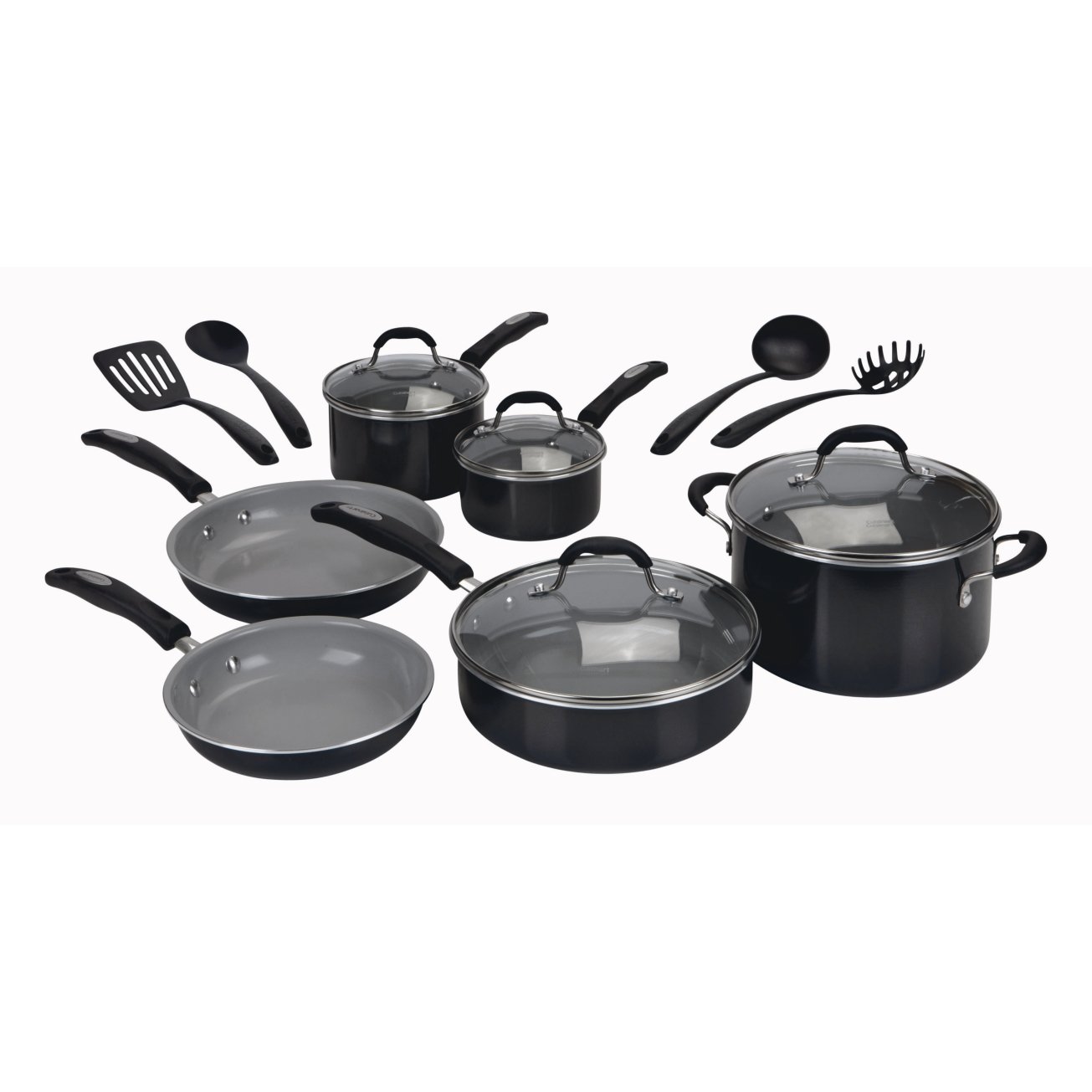 • The Cuisinart 14 Piece Ceramic Nonstick Aluminum Cookware Set with Glass Lids is a