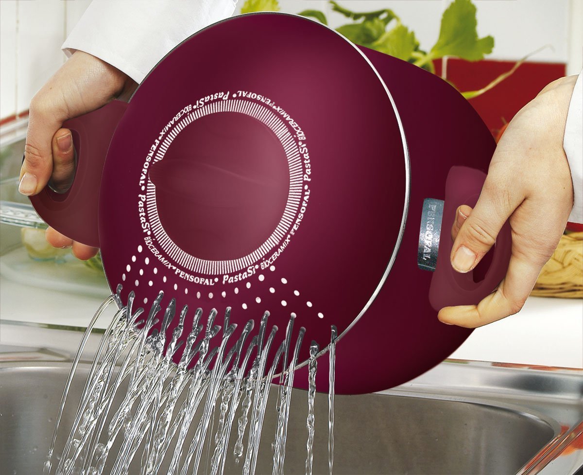 red cookware set provides the pieces essential for day top day cooking. The unique T-fal Thermo-Spot heat indicator shows when T-fal pan is perfectly preheated to seal in the flavor of your food. The non-stick exterior is fast and easy to clean and the cookware set is dishwasher safe. The 12-piece set is compatible with all cooktops except induction. This 12-piece set includes 7.75-inch and 11-inch fry pans, 1-quart and 2-quart sauce pans with lids, 5.5-quart dutch oven with lid, 10.25-inch griddle, spoon, ladle, and slotted spatula.the Pensofal Princess Passion Bioceramix Non-Stick PastaSi with Locking Lid, 5-Quart red cookware set come with Thermo-Spot technology. Thermo-Spot is T-fal’s unique heat indicator that shows when your pan is perfectly preheated. Adding food to a properly preheated pan seals in the natural juices of meat, poultry and fish for moist, delicious results.The T-fal Signature Non-stick cookware set features Expert non-stick interior which is exceptionally durable and scratch resistant. Expert non-stick interior is safe for use with metal utensils. The non-stick exterior is fast and easy to clean and is dishwasher safe. The even heat base allows for even heat distribution for reliable cooking results.Created with the home chef in mind, T-fal Signature nonstick cookware provides an array of user-friendly features. Its innovative T-fal Thermo-Spot heat indicator makes it easy to properly pre-heat pans, which helps seal in the flavor of food, whether sautéing or searing. When the pattern in the center turns to a solid red spot, the pan is hot and ready to cook. The cookware’s heavy-gauge aluminum construction heats quickly and offers long-lasting strength, while its even-heat base distributes heat throughout for reliable cooking results. Use the cookware on any cook top, except for induction. Recyclable and PFOA-, Lead-, and Cadmium-free, the cookware’s durable nonstick surfaces—inside and out—offer effortless food release (little to no fat needed), quick and easy cleaning, and a healthier choice when it comes to cookware.Pensofal Princess Passion Bioceramix Non-Stick PastaSi with Locking Lid, 5-Quart is best for youCook and drain pasta, potatoes, rice and more in this multi-use pot that has a strainer built into the lid! With it's exclusive patented locking system, simply place the lid on the pot and turn clockwise until lid is secure. Once lid is locked in place, you can safely pour off the water through the drainage system in the lid eliminating the need for additional strainers or colanders.. Pensofal Cookware features a BioCeramix non-stick coating that is exclusive to Pensofal. You can make yourself healthier cooking your favorite recipes with Pensofal Cookware. The BioCeramix coating is composed of several layers of non-stick coating bonded to a reinforced ceramic base creating a non-stick cooking surface that is always smooth and completely impermeable. The coating has no PFOAs and is 100% lead-free. Each Pensofal pan features a stainless steel plate bonded to the outside surface of the aluminum bottom which promotes even heat distribution across the pan's bottom and makes the pan suitable for all cooking applications including electric, gas, and induction. The BioCeramix coating is applied to both the inside and the outside of each pan making cleanup easy. The pan is dishwasher safe. This pasta cooker features double Bakelite handles on either side of the pan that are designed for comfort with a soft touch treatment for a safer grip. The handles are heat resistant up to 700 degrees fahrenheit. The superior non-stick performance of the BioCeramix coating is recognized by international cooks and has been tested by specialized institutes throughout the world. Pensofal cookware comes with a five-year guarantee. This pasta cooker is a family size that measures 7-3/4 inches in diamter and has a 5 quart capacity. Gift Boxed. Made in Italy. Model #07PEN9716.