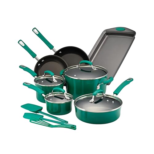 red cookware set provides the pieces essential for day top day cooking. The unique T-fal Thermo-Spot heat indicator shows when T-fal pan is perfectly preheated to seal in the flavor of your food. The non-stick exterior is fast and easy to clean and the cookware set is dishwasher safe. The 12-piece set is compatible with all cooktops except induction. This 12-piece set includes 7.75-inch and 11-inch fry pans, 1-quart and 2-quart sauce pans with lids, 5.5-quart dutch oven with lid, 10.25-inch griddle, spoon, ladle, and slotted spatula.the Rachael Ray Hard Porcelain Enamel Nonstick Cookware Set, 14-Piece, Fennel Gradient red cookware set come with Thermo-Spot technology. Thermo-Spot is T-fal’s unique heat indicator that shows when your pan is perfectly preheated. Adding food to a properly preheated pan seals in the natural juices of meat, poultry and fish for moist, delicious results.The T-fal Signature Non-stick cookware set features Expert non-stick interior which is exceptionally durable and scratch resistant. Expert non-stick interior is safe for use with metal utensils. The non-stick exterior is fast and easy to clean and is dishwasher safe. The even heat base allows for even heat distribution for reliable cooking results.Created with the home chef in mind, T-fal Signature nonstick cookware provides an array of user-friendly features. Its innovative T-fal Thermo-Spot heat indicator makes it easy to properly pre-heat pans, which helps seal in the flavor of food, whether sautéing or searing. When the pattern in the center turns to a solid red spot, the pan is hot and ready to cook. The cookware’s heavy-gauge aluminum construction heats quickly and offers long-lasting strength, while its even-heat base distributes heat throughout for reliable cooking results. Use the cookware on any cook top, except for induction. Recyclable and PFOA-, Lead-, and Cadmium-free, the cookware’s durable nonstick surfaces—inside and out—offer effortless food release (little to no fat needed), quick and easy cleaning, and a healthier choice when it comes to cookware.Rachael Ray Hard Porcelain Enamel Nonstick Cookware Set, 14-Piece, Fennel Gradient is best for youColor:Fennel Gradient | Size:14 Cooks new and experienced alike will appreciate the essential pieces included in the Rachael Ray(r) Hard Porcelain Enamel Nonstick 14-Piece Cookware Set with bakeware and kitchen tools. Whether your cooking tasks are simmering and searing or browning and baking, Rachael Ray(r) cookware gets the kitchen set. From the reliable cooking performance to the fun, contemporary colors and durable materials, the pots and pans in this collection can handle everyone's favorite dishes, and then some. Sturdy aluminum construction promotes even heating, helping to reduce hot spots that can burn foods, and the durable two-tone porcelain enamel cookware exteriors show plenty of stylish kitchen personality. Rachael Ray(r) porcelain enamel cookware features long-lasting nonstick interiors that provide beautiful food release and make cleanup snappy. Oven safe to 350 DegreeF, the cookware's comfortable grippy handles are double riveted for extra strength, and the shatter-resistant glass lids lock in heat and moisture. The cookware comes with a nonstick 10 x 15 baking sheet that sports colorfully coordinating silicone handle grips and is oven safe to 450 DegreeF. And the nonstick-suitable cooking tools included - a nylon turner, silicone spoonula and silicone spatula - are smartly-designed so your cooking really cooks! Make, bake and share favorite foods and show off a lot of personality with the bold and contemporary Rachael Ray(r) Hard Porcelain Enamel Nonstick 14-Piece Cookware Set.