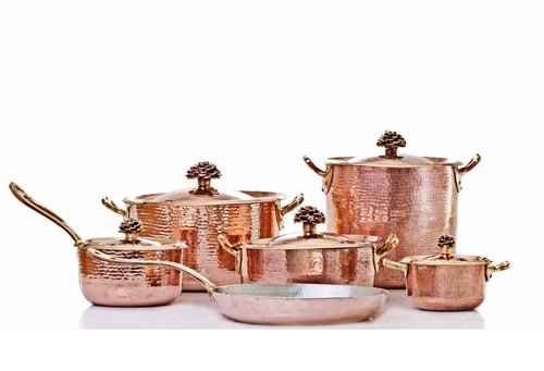 red cookware set provides the pieces essential for day top day cooking. The unique T-fal Thermo-Spot heat indicator shows when T-fal pan is perfectly preheated to seal in the flavor of your food. The non-stick exterior is fast and easy to clean and the cookware set is dishwasher safe. The 12-piece set is compatible with all cooktops except induction. This 12-piece set includes 7.75-inch and 11-inch fry pans, 1-quart and 2-quart sauce pans with lids, 5.5-quart dutch oven with lid, 10.25-inch griddle, spoon, ladle, and slotted spatula.the Amoretti Bros Copper 11 pc Cookware Set w/Flower Lids red cookware set come with Thermo-Spot technology. Thermo-Spot is T-fal’s unique heat indicator that shows when your pan is perfectly preheated. Adding food to a properly preheated pan seals in the natural juices of meat, poultry and fish for moist, delicious results.The T-fal Signature Non-stick cookware set features Expert non-stick interior which is exceptionally durable and scratch resistant. Expert non-stick interior is safe for use with metal utensils. The non-stick exterior is fast and easy to clean and is dishwasher safe. The even heat base allows for even heat distribution for reliable cooking results.Created with the home chef in mind, T-fal Signature nonstick cookware provides an array of user-friendly features. Its innovative T-fal Thermo-Spot heat indicator makes it easy to properly pre-heat pans, which helps seal in the flavor of food, whether sautéing or searing. When the pattern in the center turns to a solid red spot, the pan is hot and ready to cook. The cookware’s heavy-gauge aluminum construction heats quickly and offers long-lasting strength, while its even-heat base distributes heat throughout for reliable cooking results. Use the cookware on any cook top, except for induction. Recyclable and PFOA-, Lead-, and Cadmium-free, the cookware’s durable nonstick surfaces—inside and out—offer effortless food release (little to no fat needed), quick and easy cleaning, and a healthier choice when it comes to cookware.Amoretti Bros Copper 11 pc Cookware Set w/Flower Lids is best for youEverything you could possibly need for your kitchen, this 11-pieces cookware set contains the following items: 1.3 quart sauce pan with lid 4.4 quart saut? pan with lid 5.7 quart sauce pan with lid 9 inch frying pan, 10qt Stock pot and a 2.8 qt sauce pan with long handle. ?Fiore? signature Lid. Made with 2mm hand-hammered copper, these pans are tin lined on the cooking surface with a double layer of tin.