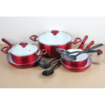 red cookware set provides the pieces essential for day top day cooking. The unique T-fal Thermo-Spot heat indicator shows when T-fal pan is perfectly preheated to seal in the flavor of your food. The non-stick exterior is fast and easy to clean and the cookware set is dishwasher safe. The 12-piece set is compatible with all cooktops except induction. This 12-piece set includes 7.75-inch and 11-inch fry pans, 1-quart and 2-quart sauce pans with lids, 5.5-quart dutch oven with lid, 10.25-inch griddle, spoon, ladle, and slotted spatula.the 12 Piece Ceramic Cookware red cookware set come with Thermo-Spot technology. Thermo-Spot is T-fal’s unique heat indicator that shows when your pan is perfectly preheated. Adding food to a properly preheated pan seals in the natural juices of meat, poultry and fish for moist, delicious results.The T-fal Signature Non-stick cookware set features Expert non-stick interior which is exceptionally durable and scratch resistant. Expert non-stick interior is safe for use with metal utensils. The non-stick exterior is fast and easy to clean and is dishwasher safe. The even heat base allows for even heat distribution for reliable cooking results.Created with the home chef in mind, T-fal Signature nonstick cookware provides an array of user-friendly features. Its innovative T-fal Thermo-Spot heat indicator makes it easy to properly pre-heat pans, which helps seal in the flavor of food, whether sautéing or searing. When the pattern in the center turns to a solid red spot, the pan is hot and ready to cook. The cookware’s heavy-gauge aluminum construction heats quickly and offers long-lasting strength, while its even-heat base distributes heat throughout for reliable cooking results. Use the cookware on any cook top, except for induction. Recyclable and PFOA-, Lead-, and Cadmium-free, the cookware’s durable nonstick surfaces—inside and out—offer effortless food release (little to no fat needed), quick and easy cleaning, and a healthier choice when it comes to cookware.12 Piece Ceramic Cookware is best for youAmazing non-stick cooking performance without dangerous PTFE/PFOA or calorie-laden fats! This 12-pc. Savoureux Pro Line™ cookware set uses a natural ceramic coating that provides the non-stick cooking you're looking for without PTFE/PFOA coatings that can emit harmful fumes when overheated. And you don't need to use fats or oils so foods are healthier for you! Features aluminum design for even heat distribution, tempered glass lids and stay-cool Bakelite handles. Includes: 2-qt. & 5-qt. Dutch ovens with lids, 1-qt. saucepan with lid, 9.5' & 8' frying pans & 4 nylon utensils. Oven safe up to 250 degrees.