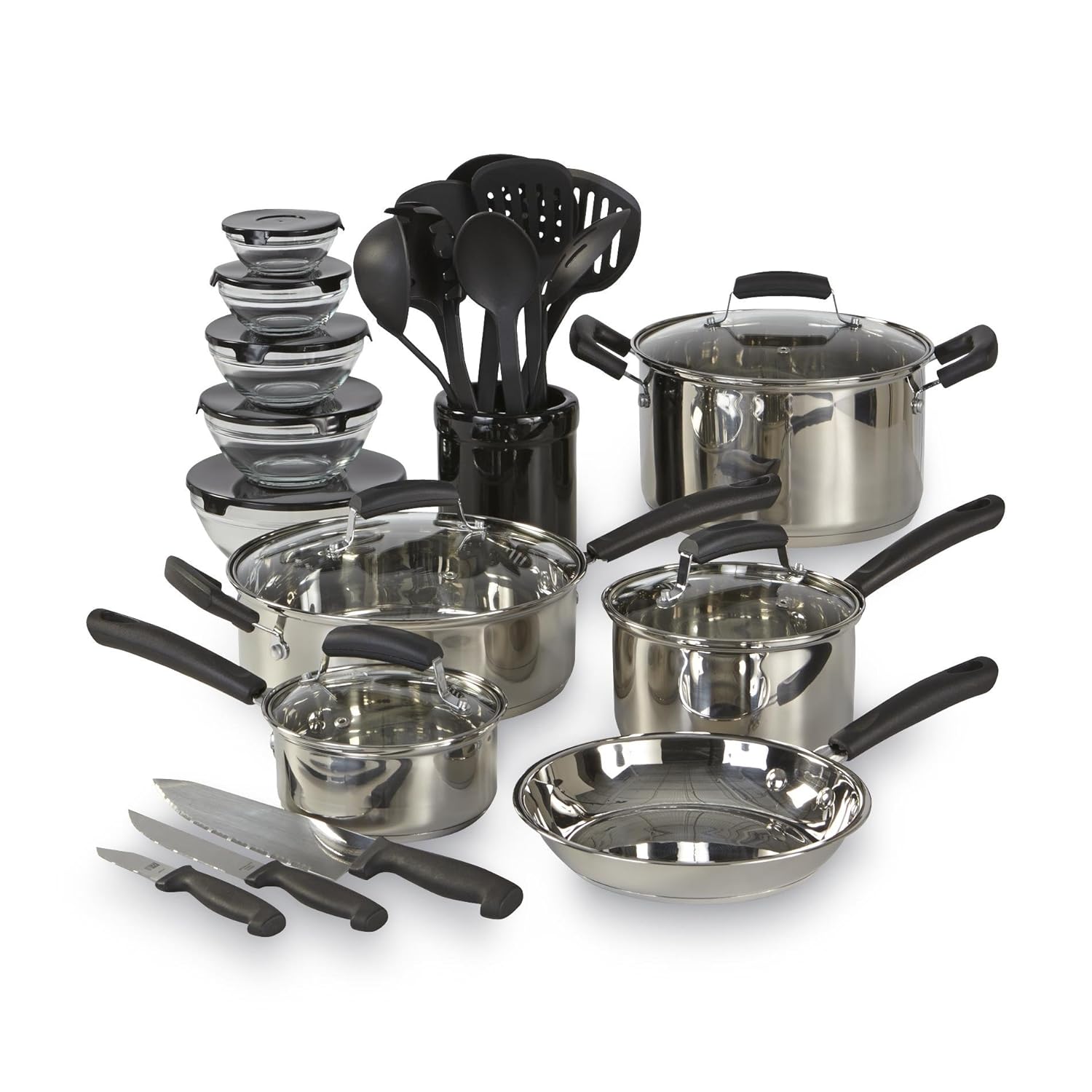• The Essential Home 25-Piece Stainless Steel Mega Cookware Set is a
