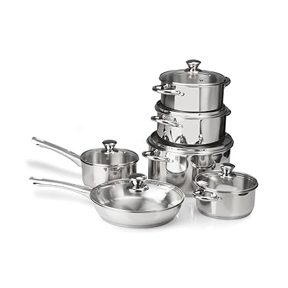 • The FortheChef's 12 Piece Stainless Steel Cookware Set with Tempered Glass Lids & Stainless Steel Handles & Knobs is a