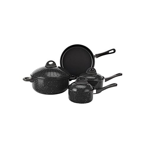 • The Home N Kitchenware Collection 7pc Cookware Set, Non-stick Carbon Steel Marble Coating Pasta Pot Pan Set, Metal Lids, Stay Cool Handle is a