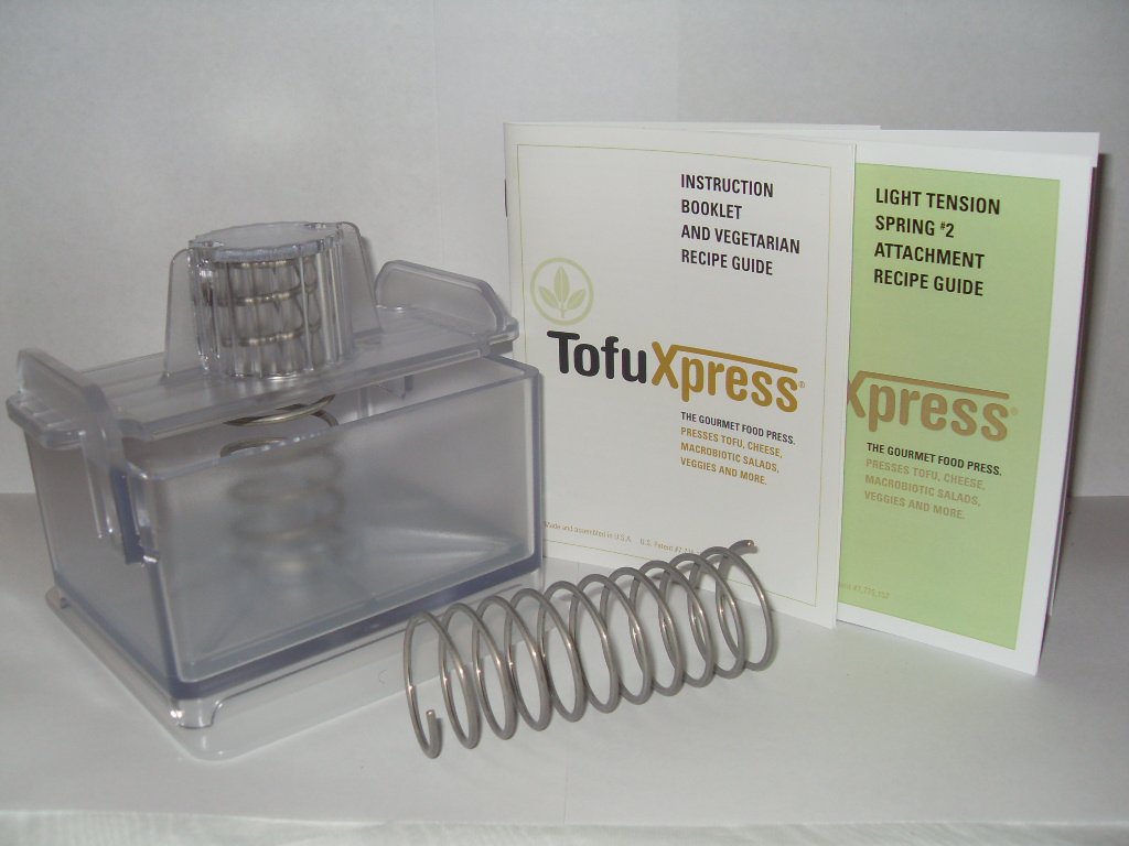 • The Gourmet Tofu Press / Marinating Dish - Clear - w/Light Tension Spring Attachment. TofuXpress removes moisture from tofu and other foods automatically without mess. Make cheese, greek-style yogurt, macrobiotic salads. is a